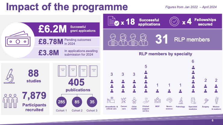 The Research Leaders Programme aimed to identify staff in all clinical disciplines with research leadership potential, and provide them with time, training, personal and professional development to enable them to progress their careers and build research capacity.